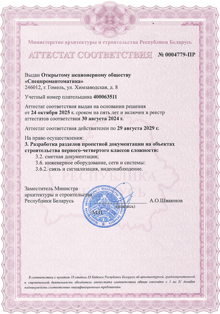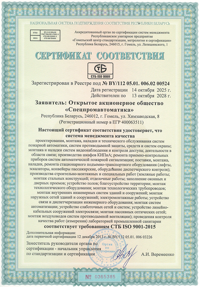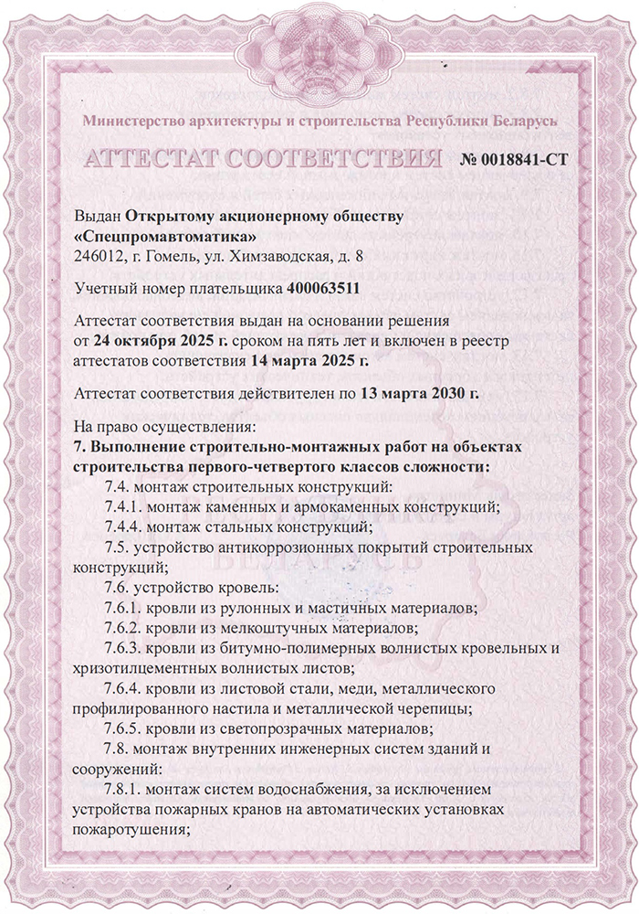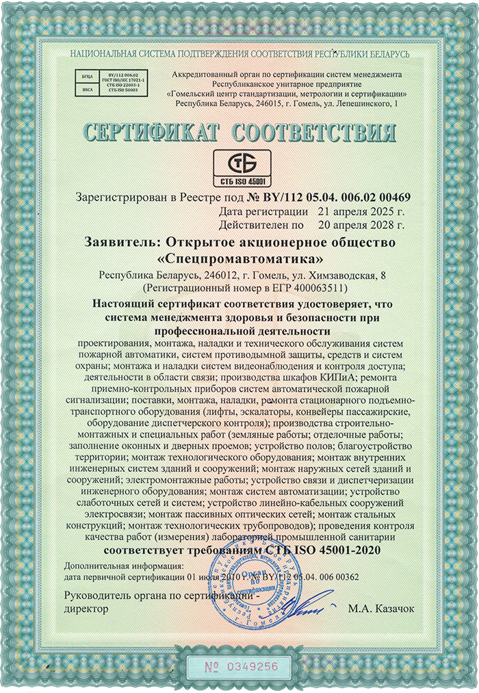 История ОАО «Спецпромавтоматика» началась в 1975 году, и за прошедшие пять десятилетий предприятие зарекомендовало себя как один из лидеров в области проектирования, монтажа и обслуживания современных систем противопожарной защиты и безопасности в Республике Беларусь. Одним из ключевых факторов успеха ОАО «Спецпромавтоматика» является его уникальная возможность предоставлять услуги по обслуживанию зданий повышенной этажности. ОАО «Спецпромавтоматика» входит в состав холдинга «МЭТЗ им. В.И. Козлова».